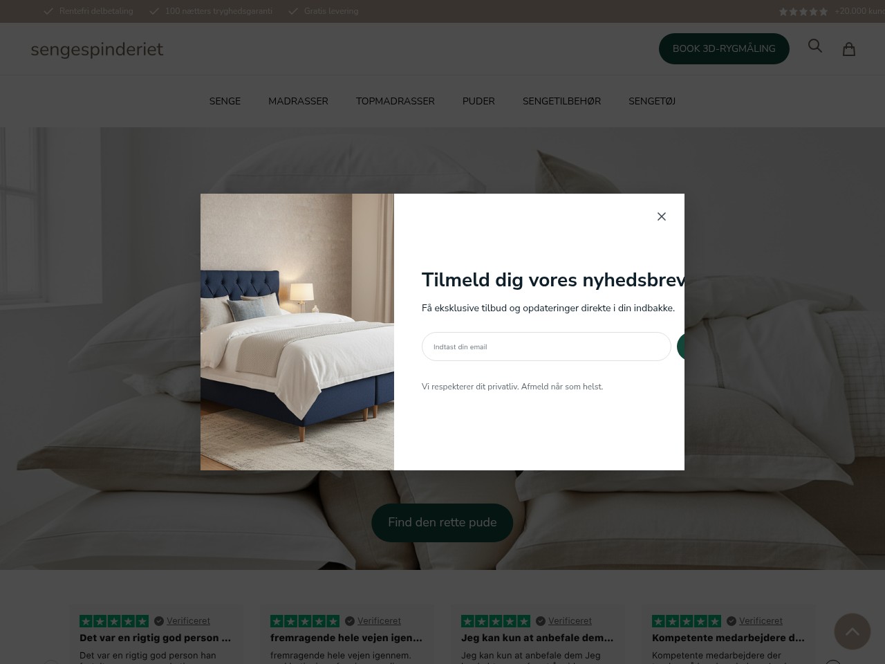 Sengespinderiet er en dansk webshop der specialiserer sig i premium senge, madrasser og søvnprodukter. Med over 20.000 kundeanmeldelser og et stærkt brand havde de brug for en e-commerce oplevelse der matchede deres position som markedsleder.