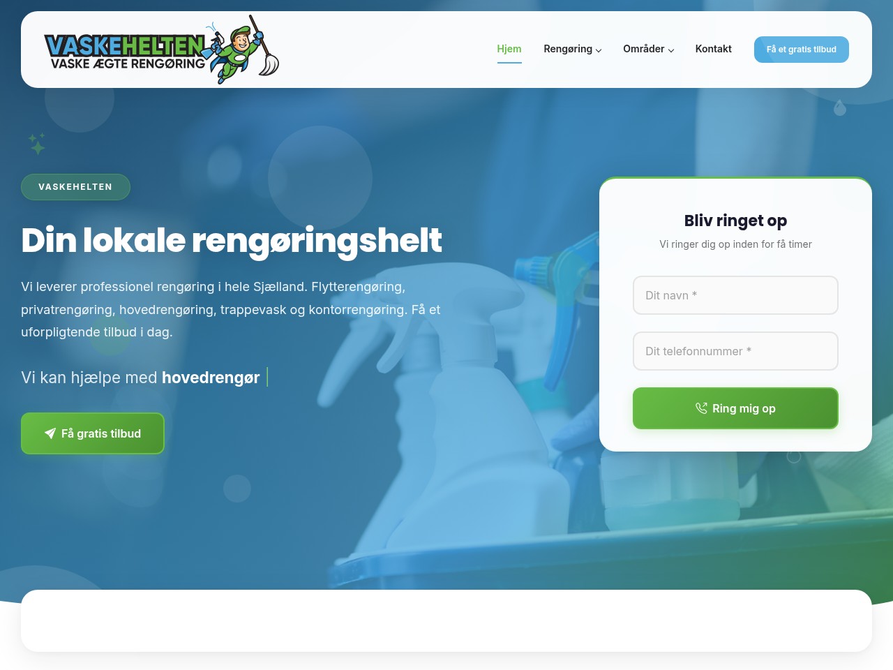 Vaskehelten er en professionel rengøringsvirksomhed med base på Sjælland, der tilbyder alt fra flytterengøring til erhvervsrengøring. De havde brug for en stærk online tilstedeværelse der kunne generere leads og positionere dem som det foretrukne valg i deres lokalområde.